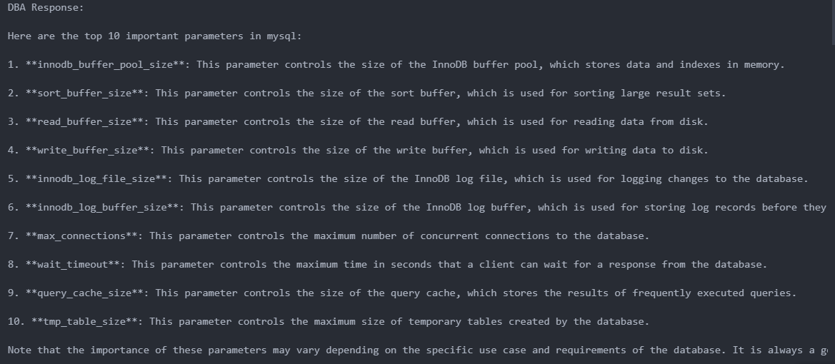 이렇게 예를 들어서 "넌 DBA야. mysql에서 중요한 10개의 파라미터는 어떤게 있어?"