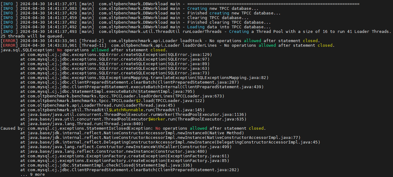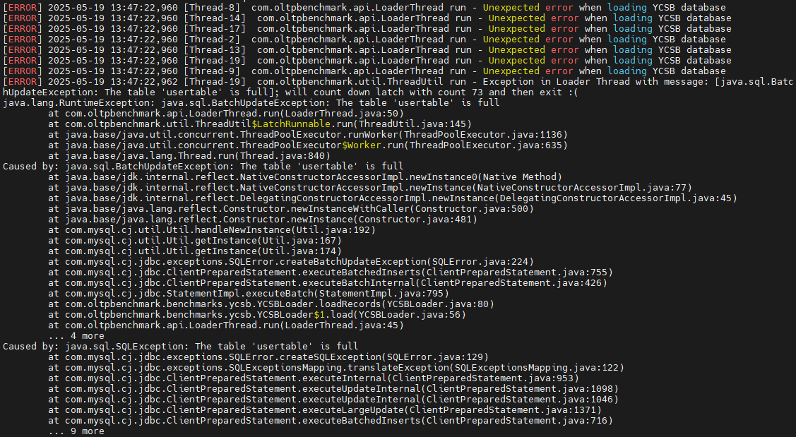 데이터베이스의 성능을 측정할 수 있는 benchbase를 사용할 때, 데이터를 로드하는 과정에서 가끔 이런 오류가 발생한다. 빨간 에러 .. 대충 읽어보면 데이터를 적재할 table이 full ~ 이다 라는 에러인데, 대부분 디스크 용량 부족인 경우가 많다. 이러한 경우에는 간단하게 rm /usr/local/mysql/data/*.log 명령어를 쳐주면~ log 관련 필요없는 내용들이 사라지면서 디스크 확보가 가능! 이렇게 삭제하고나서 다시 데이터 적재를 하면 문제없이 잘 돌아간다!